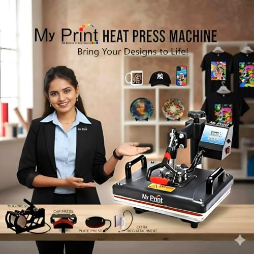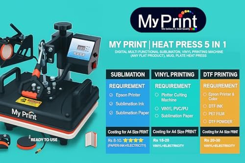 | Item Type | MY PRINT, Heat Press 5 in 1 Digital Multi Functional, DTF PRINTING, Sublimation Printing, Vinyl Printing Machine for T-Shirts (Any Flat Product), with Cap Press, Plate Press, Mug Press, with extra Mug Attachment, 12×15 Inch, for Business Supplies |